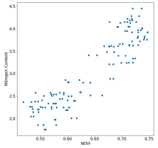 The linear regression model was then applied to the testing dataset and the correlation between the prediction and the ground truth data was plotted, as shown in Figure 7. The correlation had an R2 of 0.805 and a root-mean-squared error (RMSE) of 0.338. The strong correlation showed that the mean NDVI value of the leaf could be a good predictor for the N content of the entire plant.