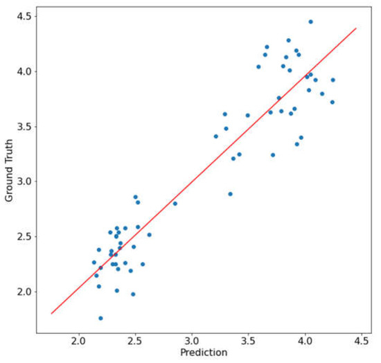 The deep learning model was trained on the training dataset over 50 epochs and the model was applied to the test dataset. The correlation analysis was performed on the predicted N content. The scatter plot of the test dataset ground truth and prediction is shown in Figure 8. The results showed that the correlation between the ground truth and predicted N content had an R2 of 0.871 and an RMSE of 0.276. There was a significant improvement in the R2 value and the RMSE compared to the results from the mean NDVI method as the prediction based on the whole-leaf NDVI heatmap could use the distribution of the NDVI to improve the results. Moreover, the deep learning neural network could extract non-linear information from the whole-leaf NDVI heatmap that was not available in the mean NDVI method.