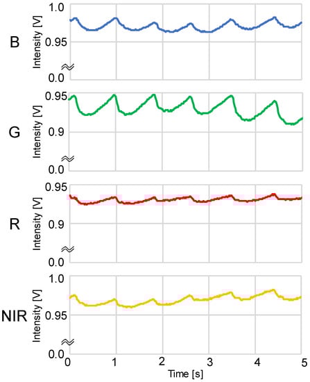 Example of simultaneous recordings of blue, green, red, and near-infrared light photoplethysmograms (PPGs) measured using a DC amp: B = blue LED PPG, G = green LED PPG, R = red LED PPG, and NIR = near-infrared LED PPG.