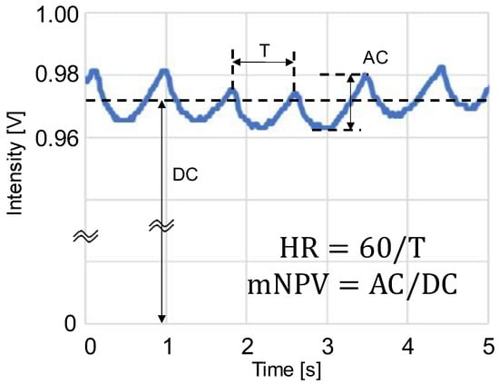 Schematic of photoplethysmogram (PPG) waveform feature values: AC is the amplitude of PPG, DC is the mean value of PPG, T is the peak interval time, HR = heart rate, and mNPV = modified normalized pulse volume [31].