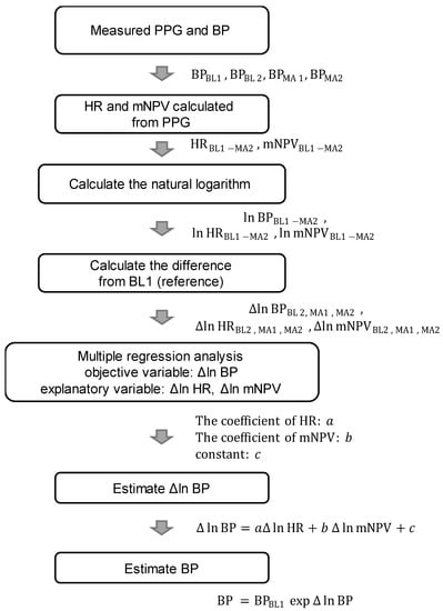 Figure 5 shows a flowchart of BP estimation with this method. As shown in Figure 4, 4 BP measurements were taken per participant, 2 in BL (BL1 and BL2) and 2 in MA (MA1 and MA2). The HR and mNPV for each beat were calculated from the PPG waveform at 2–30 s from the start of the BP measurement and averaged. Then, the natural logarithms of HR (ln HRBL1, ln HRBL2, ln HRMA1, and ln HRMA2), mNPV (ln mNPVBL1, ln mNPVBL2, ln mNPVMA1, and ln mNPVMA2), SBP (ln SBPBL1, ln SBPBL2, ln SBPMA1, and ln SBPMA2), DBP (ln DBPBL1, ln DBPBL2, ln DBPMA1, and ln DBPMA2), and MAP (ln MAPBL1, ln MAPBL2, ln MAPMA1, and ln MAPMA2) for each period were calculated to normalize the distribution.