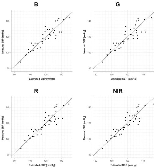 Accuracy of systolic blood pressure (SBP) estimation at each wavelength. Scatterplots of SBP estimated using proposed method and SBP measured with a cuff sphygmomanometer (N = 42). From left to right, the light source wavelengths are blue (B), green (G), red (R), and near-infrared (NIR). The solid line on each scatterplot is the regression line with geometric mean regression.