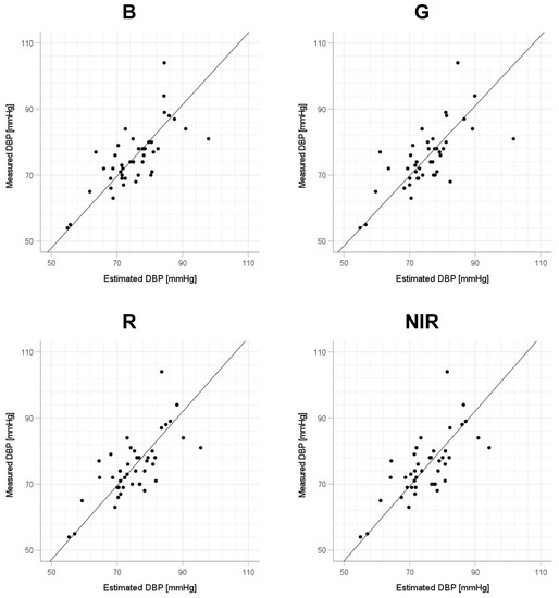 Accuracy of diastolic blood pressure (DBP) estimation at each wavelength. Scatterplots of DBP estimated using proposed method and DBP measured with a cuff sphygmomanometer (N = 42). From left to right, the light source wavelengths are blue (B), green (G), red (R), and near-infrared (NIR). The solid line on each scatterplot is the regression line with geometric mean regression.