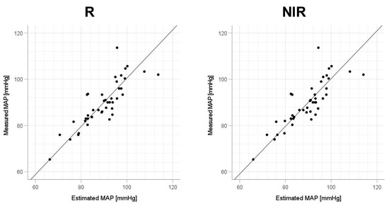 Focusing on the R2 values in Table 3, we consider the optimal wavelengths for SBP, DBP, and MAP. For SBP, NIR is the optimal wavelength because of its largest R2 (=0.634) in the order of NIR > blue > red > green. Similarly, for DBP and MAP, the order is blue > NIR > red > green, so blue is the optimal wavelength (R2 = 0.497 for DBP and R2 = 0.630 for MAP). However, these differences were not statistically significant. Furthermore, we focus on the values of the standard partial regression coefficient (std. β) of the β coefficients for HR (a) and mNPV (b) at the optimal wavelengths (SBP: NIR; DBP and MAP: blue) in Table 3. For SBP, the coefficient a was larger than b for std. β. For DBP, b was larger than a. For MAP, a and b were about the same. Previous studies have shown that HR depends on CO in SBP [40,41], TPR in DBP [41], and CO and TPR in MAP [14]. Because CO and TPR are associated with HR and mNPV, respectively [28,29,30,31,32], the trend of std. β, whereby the a of HR is dominant in SBP and the b of mNPV is dominant in DBP, agrees well with physiological trends.