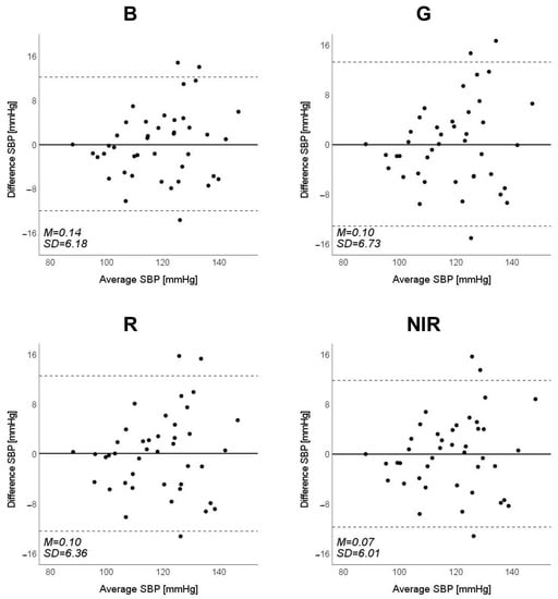 Bland–Altman plots of estimated systolic blood pressure (SBP) against those measured with a cuff sphygmomanometer (N = 42). From left to right, the light source is blue (B), green (G), red (R), and near-infrared (NIR). The solid line and the dashed lines on each plot represent fixed bias (M) and M ± 1.96 standard deviation range, respectively.