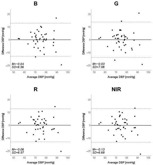 Bland–Altman plots of estimated diastolic blood pressure (DBP) against those measured with a cuff sphygmomanometer (N = 42). From left to right, the light source is blue (B), green (G), red (R), and near-infrared (NIR). The solid line and the dashed lines on each plot represent fixed bias (M) and M ± 1.96 standard deviation range, respectively.