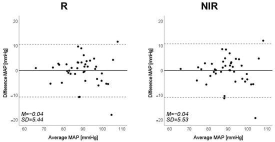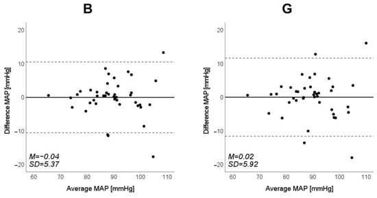 Bland–Altman plots of estimated mean arterial pressure (MAP) against those measured with a cuff sphygmomanometer (N = 42). From left to right, the light source is blue (B), green (G), red (R), and near-infrared (NIR). The solid line and the dashed lines on each plot represent fixed bias (M) and M ± 1.96 standard deviation range, respectively.
