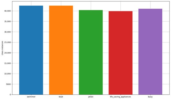 After describing the POSEIDON pipeline, we conducted several experiments to evaluate its performance compared to other methods. We utilized the compressed version of the SeaDronesSee Object Detection v2 dataset and trained the model for four iterations on the complete training dataset. The tool was able to balance all classes in the new dataset, resulting in an augmented training set of 27,414 samples, as opposed to the original 8931 images. The distribution of instances among the different classes in the augmented training set is shown in Figure 9.