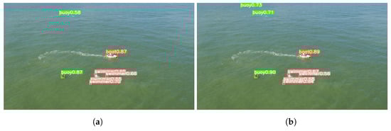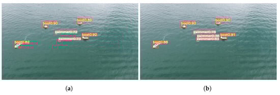 Despite swimmers being the class with the least amount of improvement, Figure 12 demonstrates that the model trained with the augmented dataset is capable of detecting all swimmers, while the model trained with the original dataset is not. Furthermore, as depicted in Figure 13, the former model also exhibits superior performance in detecting small objects that are situated at a greater distance, such as the buoy.