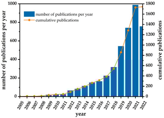 Number of publications per year and cumulative publications regarding nanosilver-based electrochemical sensors for environmental analysis.