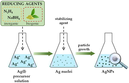 Atoms and molecules represent elementary building blocks for controlled bottom-up assembly into a nanostructured material. Therefore, this synthetic route is also referred to as the building-up approach [38]. Several bottom-up methods in solutions have the same denominator—a controlled reduction of Ag+ ions from a silver precursor species to elemental silver. This process can be carried out using appropriate chemical compounds or biomolecules as reducing agents, or with the help of an external source such as electrical current. Thus, these are the basic principles of chemical, biological, and electrochemical preparation methods.