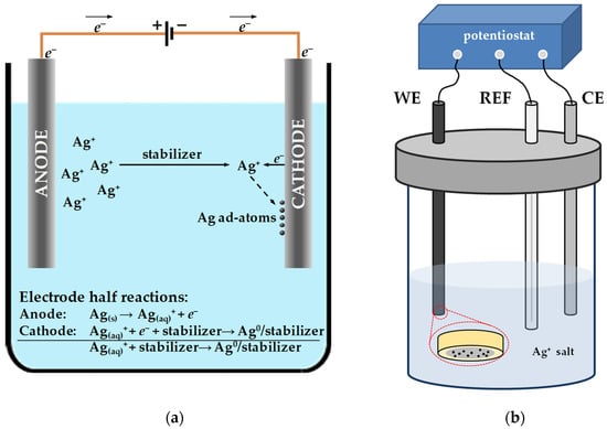 Electrochemical synthesis represents a logical method for the production of AgNPs, since the chemical conversion of ionic silver species to zero-valent metal is a one-electron involving reaction. In electrochemical synthetic pathways electric current acts as a reducing agent. This means that the size of the nanoparticles can be precisely controlled by adjusting the current density. In addition, compared to the bottom-up strategies mentioned above, there is no need to introduce additional toxic chemicals into the reaction mixture. This means that the particles produced are of high purity, and the electrochemical approach is consistent with the principles of green chemistry [71]. The general electrolysis cell, consisting of reference and sacrificial electrode, serves as a reactor for the fabrication of AgNPs (Figure 3a). In brief, the electrochemical process begins with the oxidative dissolution of the silver anode, whereupon silver ions migrate through the bulk solution toward the cathodic zone. At the surface of the cathode, the ions are reduced and zero-valent silver nanoparticle seeds are formed. In the bulk solution, the stabilized nanoclusters are subjected to the Ostwald ripening process, until the final silver nanoparticle is formed [72].