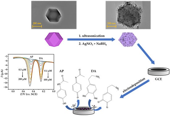 Over the recent decades, a variety of nanomaterials have been employed in fabrication of electrochemical sensors aiming to improve their analytical features [11,12]. The selection of functional electrode-modifying material may overcome the common analytical problems of bare electrodes, such as electrode fouling and overlapping of the redox-potential in the simultaneous determination of multiple analytes. In this context, silver nanoparticles (AgNPs) are one of the most relevant and frequently used materials for the development of versatile electrochemical sensing platforms due to their unique physicochemical properties [13]. AgNPs can be produced in an easy and cost-effective way with various morphologies, have an adjustable architecture, and are stable at room temperature. The versatility of nanosilver enables its application in a wide range of fields, from medicine (drug delivery, imaging, chemotherapeutics, gene therapy) [14], the textile industry (odour control) [15,16,17], and the food industry (safety and quality) [18], to supercapacitors and energy storage devices [19]. AgNPs also have unique catalytic properties (degradation of small organic molecules) [20,21] and superior electrical conductivity (conductive inks for printed electronics) [22,23,24]. Due to the effect of surface plasmon resonance (SPR), which is very sensitive to the particle morphology and the relative permittivity of the surrounding medium, AgNPs possess unique optical properties and can, therefore, be used as outstanding colorimetric, fluorimetric, and surface-enhanced Raman spectroscopy (SERS) nanoprobes [25,26,27,28,29]. The electrocatalytic activity in conjunction with excellent conductivity makes AgNPs a superior material for electrode surface decoration, providing a multiform base for the development of high-performance electrochemical sensors [30].