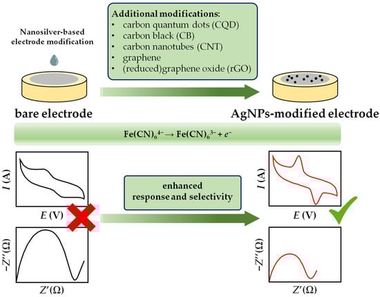The performance of all electrochemical sensors is strongly influenced by the working electrodes. In general, the redox reaction of the electroactive species at the bare electrodes (metal electrodes, glassy carbon electrodes, screen-printed or paste (carbon) electrodes, inkjet-printed electrodes) is often difficult due to the slower kinetics of the electrochemical reactions for a number of compounds and overpotential requirements. To improve the sensing mechanism, bare electrodes are usually modified with nanoengineered materials that exhibit excellent electrical conductivity and high catalytic activity such as silver [6]. Silver nanoparticles have been widely demonstrated as ideal candidates for sensing applications. Ideally, particles with a smaller size provide a larger fraction of silver atoms accessible to reactant molecules, making them a promising material for electrochemical sensors. However, AgNPs with a zero-net charge tend to coalesce into larger clusters with a lower surface-to-volume ratio. Therefore, to preserve the unique thermal and electrical properties of AgNPs, significant progress has been made towards the synthesis of AgNPs with controllable morphology, dimensions, surface charge, and physicochemical properties. To improve their sensing properties, AgNPs are often integrated into nanocomposite materials, e.g., by alloying with some another metal [83], embedded into single- [84] or multiwalled [74] carbon nanotubes, anchored on functionalized graphene (oxide) platforms [85,86], modified to form multifunctional ternary systems [87], or deposited in the form of a thin film on the electrode surface [88].