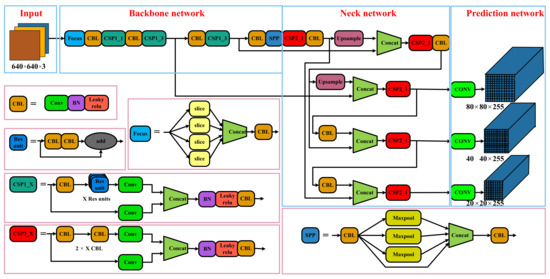The input module first performs Mosaic data enhancement on the input image, including random scaling and cropping. Immediately afterwards, the adaptive anchor box is computed to determine the best anchor box value for the adaptation. Finally, the input image is adaptively scaled. The backbone network is mainly composed of a focus structure, a CSP structure, and an SPP structure. The focus structure slices the input image, the CSP block is mainly used in the feature extraction part of the CNN to speed up the training and inference process of the model, and the SPP structure strengthens the network’s receptive field. The neck network adopts the structure of FPN and PAN, enhancing the network’s feature fusion ability. The prediction network detects objects in images and predicts their categories and locations.