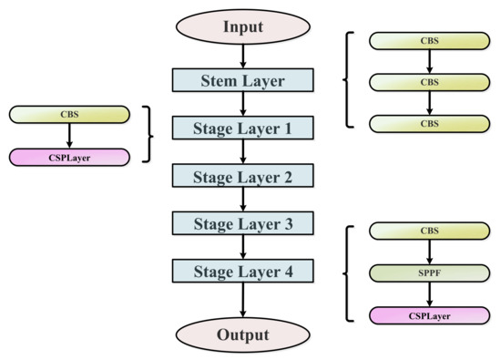 The improved YOLOv5 network uses the backbone framework of RTMDet [32]. The overall framework has a five-layer structure, including one stem layer and four stage layers. The backbone architecture is shown in Figure 4. The stem layer refers to the beginning layer, which includes three Conv blocks. As the number of convolutional layers increases, the model can extract higher-level features and richer information, which helps to improve the downstream dense detection task performance. Stages 1–3 have the same architecture, consisting of one Conv block and one CSPLayer block, while Stage 4 consists of one Conv block, one SPPF block and CSPLayer block.