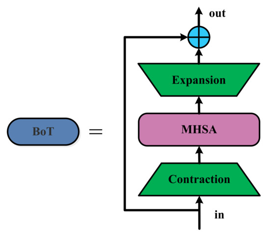 The concrete structure of BoT is presented in Figure 9. The extraction part denotes the feature extraction layer, implemented by the Conv block, and the expansion part denotes the reshape layer, which redefines the shape of the matrix through the function view. The BoT block uses the self-attention mechanism to improve the model performance, replacing the 3 × 3 spatial convolution with multi-head self-attention (MHSA) in the ResNet Bottleneck module, which extracts feature information through the global attention aggregation convolution block. The BoT block has the advantages of both the CNN and the self-attention mechanism, which allows it to focus on more meaningful content and locations, establishing global dependencies while extracting local information through convolution. Compared to the ResNet Bottleneck, BoT blocks do not employ excessive convolution operations, thus greatly reducing the number of parameters and minimizing latency overhead.