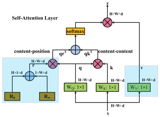 MHSA (Figure 10) adopts a multi-head self-attention mechanism, with input size of H × W × d, with H, W, and d representing the height and width of the input feature matrix and the dimension of a single token, respectively. The input data are subjected to 1 × 1 convolution operations to obtain query, key, and value encodings, following which is obtained by matrix multiplication operations for query encoding and key coding. Then, after the SoftMax operation, the result is multiplied by a matrix with value coding to obtain the output. Positional encodings and the value projections in the highlighted blue areas are not present in the non-local layer [64,65]; that is, there is no position embedding in the non-local layer. Therefore, the framework used in our experiment does not take into account position embedding. The MHSA used in this experiment focuses on content information and does not consider content positions; that is, the query code obtained by : 1 × 1 is not multiplied by the relative position code to obtain .