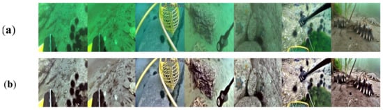 We also used the publicly available URPC2020 [66] dataset, presented for the 2020 Underwater Robot Competition Underwater object-detection Algorithm Optics Competition. There are 4200 randomly selected images in the training set of this dataset, 800 images in the validation set, and 1200 images in the test set, including echinus, starfish, holothurian, and scallop categories and object images featuring various underwater scenarios. Examples of the images in the dataset are shown in Figure 13. In this paper, the image size is changed to 416 × 416 pixels by compression operations.
