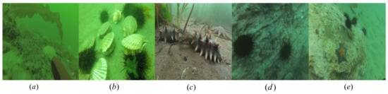 URPC2019 dataset includes five biological categories, namely (a) waterweeds, (b) scallop, (c) holothurian, (d) echinus and (e) starfish.