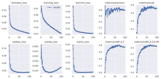 In this paper, the model was trained for 100 epochs and the training results of the improved model on URPC2019 were obtained. The different performance indicators on the training set and validation set are provided in Figure 14 below.