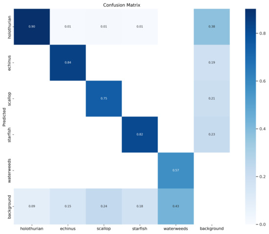 The confusion matrix of the proposed model is shown in Figure 15, which describes the prediction accuracy of our improved YOLOv5x model on the five types of underwater organisms in the dataset, as well as the relationships between the predictions. In the figure, the row direction represents the true label, the column direction represents the prediction category, and the diagonal data represent the correct detection rates. It can be seen that our model obtained a high accuracy rate for each category.