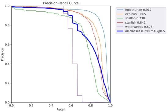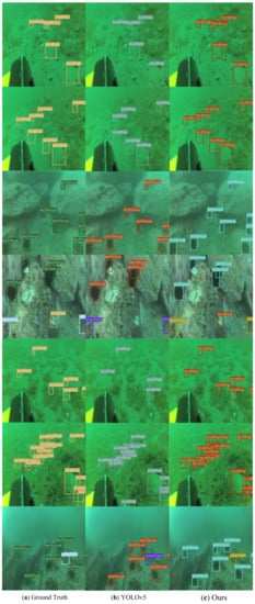Compared with our improved YOLOv5 algorithm, the original YOLOv5 had missed and false detections. There was an occluded detection target in the first row of images, and the improved YOLOv5 algorithm in column c correctly detected the scallop that was not detected by the original YOLOv5 algorithm in column b. The second and fifth rows show the detection of small targets. It can be seen that the improved YOLOv5 detected the small-sized target scallop missed by the original YOLOv5. The third, fourth, and seventh rows show the object-detection performance in underwater blurred and low-visibility scenes. As can be seen from the display diagram, the improved YOLOv5 network detected the echinus and scallop missed by the original YOLOV5. The sixth row shows the object-detection performance for a scene where the targets are dense and there is background interference. It can be seen, from column b, that the original YOLOv5 algorithm had missing and false detections of scallops, while column c shows that the detection results obtained by the improved YOLOv5 algorithm were consistent with the Ground Truth, which could better perform cross-object detection with higher accuracy under complex environments.