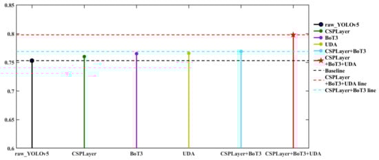 Due to the popularity of Transformer, many researchers have introduced attention mechanisms into object-detection networks. Transformer consists of Encoder and Decoder, whose entire network structures are composed entirely of layers with the attention mechanism. Each layer contains sub-modules such as the multi-head self-attention mechanism and the fully connected feed-forward neural network. The attention mechanism is mainly used to improve the performance and speed of the detection algorithm. For example, Yu et al. [52] proposed a novel multi-attention path aggregation network, APAN, which adopts a multi-attention mechanism to further improve the accuracy of multiple underwater object detection. Zhu et al. [53] improved YOLOv5 based on Transformer, replaced the original detection head with Transformer Prediction Heads (TPH), and introduced the CBAM attention module into the proposed network to improve the performance. The BoT used in BoTNet [27] is a computer vision module with a self-attention mechanism, which is mainly used to compress and accelerate the training of neural networks. Its basic principle is the use of a smaller network to simulate the behavior of a large network, to accelerate the training, capture global information, and obtain a good effect in target-intensive scenes. Therefore, in this paper, we introduce an attention mechanism module into the YOLOv5 network framework.