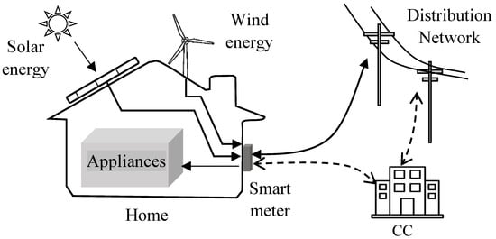 Renewable Energy Source (RES)-based smart metering system [20]. The solid lines denote flow of power, and the dashed lines denote the information flow.