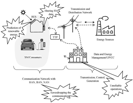 Secure communication in SG networks is vital in preserving SM privacy. Cryptography-based approaches are adopted to achieve secure communication, and they are being implemented at many points, ranging from the SM to the UP. However, the consumption report of the SM, which is sent via the communication line (or eavesdropping as described in Figure 3) can divulge information that compromises the privacy of customers [23]. Different cyberattacks can also be launched on the exchange messages [24]. Therefore, robust security measures need to be adopted to protect the communication channels.