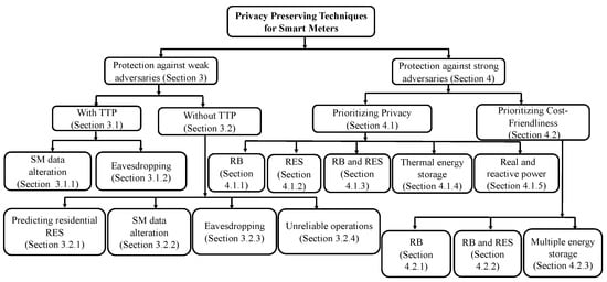 After considering the potential privacy threats to SMs in SG networks, we will now discuss various state-of-the-art privacy-preservation techniques. SM privacy can be broadly classified into two categories: (i) privacy preservation against weak adversaries and (ii) privacy preservation against strong adversaries. As defined in Section 2.4, we consider “weak adversaries” as third parties or any intruders who can occasionally eavesdrop on the communication. “Strong adversaries” refers to entities who have access to all the information available to UP. Figure 4 presents the taxonomy of our survey.