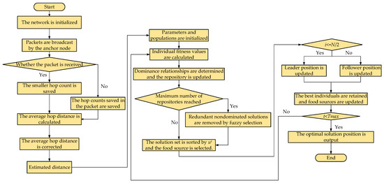 However, some scholars use intelligent algorithms to optimize DV-Hop, such as Bo et al., who applied GA to solve the localization problem of wireless sensor networks and proposed a population constraint strategy based on three beacon nodes to solve the feasible domain of the population [34]. Singh et al. used the 2D hyperbolic method to determine the unknown node location, and after that, PSO was used to correct the node location [35]. Kaur et al. replaced the original computation with the GWO algorithm in the calculation of average hop distance so that all beacon nodes could obtain the exact average hop distance [36]. Chai et al. designed a parallel WOA algorithm and introduced the tribal annexation communication strategy and the group psychological communication strategy in the parallel algorithm to enhance the population diversity of WOA and avoid local optimal solutions [37]. Li et al. proposed three parallel cat colony algorithms and applied them to solve the localization problem of wireless sensor networks, which greatly reduced the running memory and computationally optimized variables [38]. Sabahat et al. used the average position of beetles in the BAS algorithm and also introduced inertia coefficients to update the position. The application of the improved BAS to the localization problem of wireless sensor networks greatly improved the accuracy and stability of localization [39]. With the application of intelligent algorithms in wireless sensor network localization, some researchers use multi-objective optimization to solve the localization problem. For example, Wang et al. proposed a multi-objective DV-Hop algorithm based on NSGA-II, which changed the population constraint strategy based on three beacon nodes to a population constraint strategy based on all beacon nodes. The localization accuracy was improved [40]. Kanwar et al. combined six single-objective functions with three multi-objective functions and considered the effect of noise on the communication radius. The solution was performed using the multi-objective PSO algorithm and obtained good localization accuracy [41]. Huang et al. proposed to combine Manhattan and Euclidean to obtain new frequency hopping and hop distance, and used the NSGA-II algorithm for iterative optimization to improve localization accuracy and localization adaptability [42].