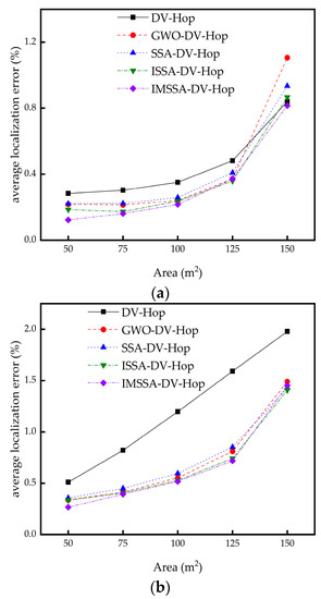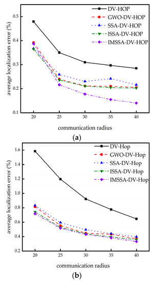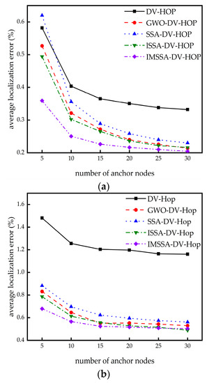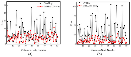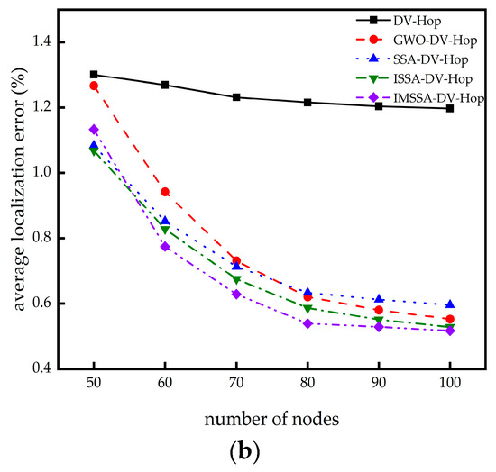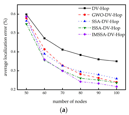 It can be seen from Figure 6a,b that in the two network topologies, the localization error of the IMSSA-DV-Hop algorithm is slightly greater than that of the three comparison algorithms when the node numbers are small. With the increase in the node numbers, the location errors of the IMSSA-DV-Hop algorithm improve significantly. No matter how the node numbers change, it is better than the DV-Hop algorithm.