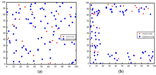 A wireless sensor network (WSN) is a wireless multi-hop communication network system composed of low-cost, low-power, and self-reconfigurable sensor nodes [1]. A WSN is a sensing network based on the self-organization structure. It is formed in a certain monitoring area with multiple sensor nodes through wireless communication technology, which has less computing, storage, and transmission capacity. Wireless sensor network technology has many advantages, such as low cost, scalability, reliability, and flexibility [2]. It is widely used in smart homes, target tracking, military security, underwater detection, and many other technical fields [3,4]. In these scenarios, the data collected and transmitted by sensors are often meaningless if they do not contain location information. Therefore, the problem of wireless sensor node location has become one of the important research topics in wireless sensor networks [5]. The detection of location becomes difficult due to the fluctuation of signals and noise in the environment. Many difficulties have been faced in location analysis [6].