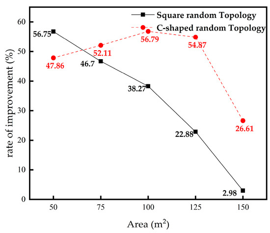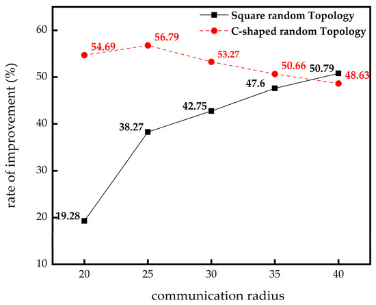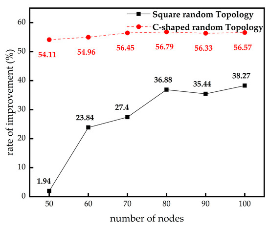 From Table 6, in square random topology, compared with the DV-Hop algorithm, the localization errors of the IMSSA-DV-Hop algorithm are reduced by 38.23%, 37.94%, 37.98%, 38.27%, 37.88%, and 38.44%. From Table 7, In the C-shaped random topology, the localization errors are reduced by 54.11%, 54.96%, 56.45%, 56.79%, 56.33%, and 56.57%. The comparison of localization error improvement is shown in Figure 9. Compared with ISSA-DV-Hop, the localization errors of IMSSA-DV-Hop in the two topologies are increased by 27.31% and 13.59%.