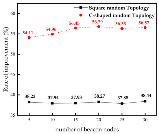 From Figure 8a,b, it can be seen that the IMSSA-DV-Hop algorithm in two random topologies can achieve lower localization error compared with the three algorithms compared in the case of fewer beacon nodes. In the C-shaped random topology, the performance of this algorithm is close to that of the ISSA-DV-Hop algorithm when the numbers of beacon nodes are large.