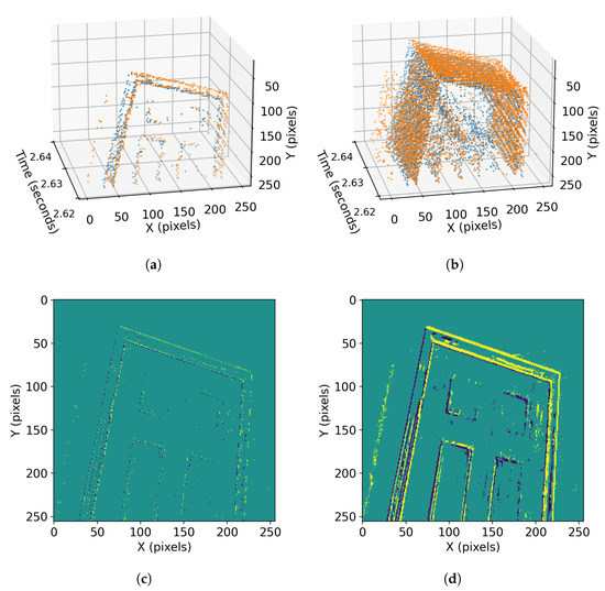 To have such spatiotemporal patterns available for extracting motion patterns, batches of more than one event must be processed. Figure 1 shows the spatiotemporal patterns in an event batch and the “motion-blur” that occurs if integrated into a single time step. While optimization algorithms operate directly on the list of data, neural network implementations require these data transformed into a 3D tensor to be fed to the network. Event iterative filters, which can operate event-by-event, can only converge after processing more than one event and, therefore, have used batches as well [14,18].