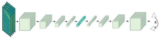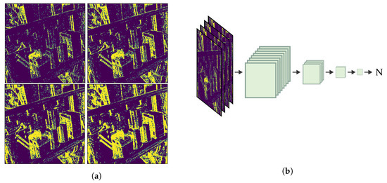 The selection network used to estimate the number of events N needed to produce a specific magnitude of rotation, without knowing the rotation itself. (a) Examples of input layers to the selection network showing , , , and , respectively, as the edges become bolder/thicker. (b) The selection network has four convolutional layers reducing the spatial–temporal information with each layer until obtaining a tensor as output.