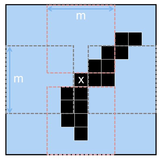 The local estimation method triggers a batch if any of the four regions of size m (red- and gray-dotted) surrounding the most recent event (center X) contains more than pixels that have been triggered by previous events (black squares). In low-noise conditions, the criteria will be met when an edge passes through any of the dotted regions, accumulating events of more than one-pixel thickness.