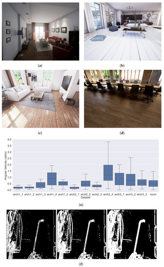 Example scenes (images from OpenCV website) (a) “room” from RealisticRendering, (b) “arch1” from ArchinteriorsVol2Scene1, (c) “arch2” from ArchinteriorsVol2Scene2, (d) “arch3” from ArchinteriorsVol2Scene3, and analysis of the simulated datasets: (e) angular velocity mean and variances of all simulated datasets, and (f) event images demonstrating rotations of , , and , from left to right.
