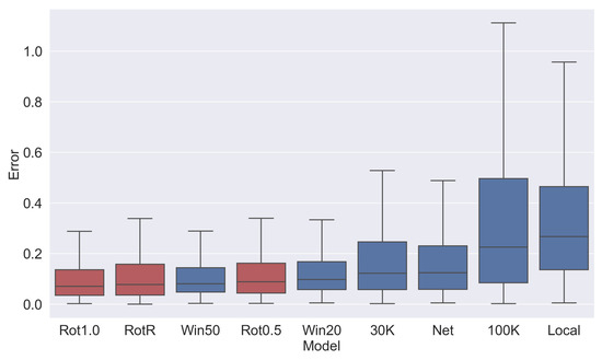 The fixed rotation networks (Rot0.5, Rot1.0, RotR) generally have the lowest error and best performance, as shown in Figure 9b. However, Figure 8 shows that fixed-time networks (Win20, Win50) perform at a comparable level and outperform 30K and Net. As fixed rotations are not valid methods for live inference (and are presented here only for comparison to a baseline), the fixed-time batches actually give the best performance.