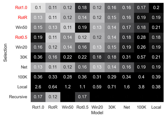 Error heatmap of all trained models evaluated with the different batch selection strategies. Selections written in red are train-only.