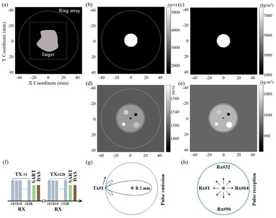 Simulation configuration of the ring array USCT. (a) Simulation setup. The medium speed (b) and density (c) of circular steel target. The medium speed (d) and density (e) of multi-layer targets. (f) Imaging sequence. Pulse emission (g) and reception (h) schematic in the first cycle.