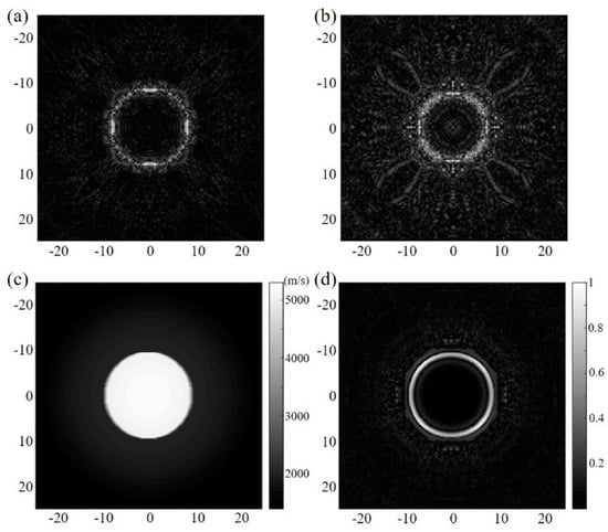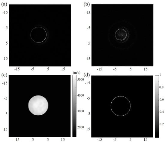 To verify the practical feasibility of the proposed method, a steel bar (diameter of 12.7 mm) with relatively large acoustic speed difference was placed in the central area of ring array ultrasound transducer. The reconstructed results shown in Figure 5a and b represent constant acoustic speed 1490 and 1540 m/s, respectively, following the ultrasonic pulse emission and reception cycle. Similar to the results from the numerical model, the ring shape of the phantom can be rendered, but the sizes (10.22 versus 7.41 mm) are seriously deteriorated due to the variation of the assumed constant speed. Hence, the calibration still needs to be additionally performed. With the two-dimensional SoS map, i.e., Figure 5c,d, is the SoS adaptive reflection image, from which we can measure that the position, shape, and size are similar to the real target. The contrast-to-noise ratio (CNR) is used to characterize the restored images and can be defined as , where , , , and are the mean intensities of the target region, background region, and the standard deviations of the above corresponding regions, respectively. The target region is selected at the edge of the steel bar, and the background region was selected in the upper left corner of each figure. The measured CNRs for Figure 5a,b,d are 12.55, 12.15, and 17.66 dB, separately. In addition, the SoS map can provide not only the target inside structure but also the acoustic speed property, where multiple contrast can be obtained in the same platform.