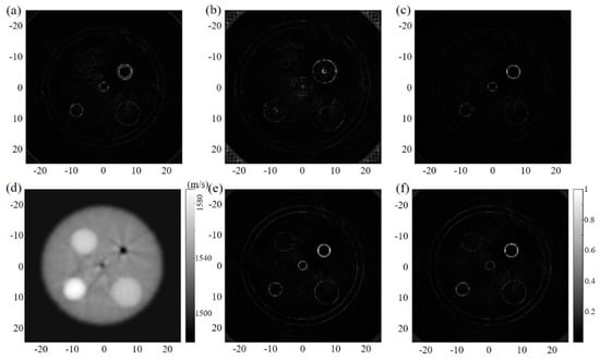 To further verify the feasibility, a relatively complex multi-target numerical model was established to study the influence of various acoustic speed differences. The acoustic speeds to recover the reflection images of Figure 3a,b are 1490 and 1540 m/s, respectively, whereas the acoustic speed is 1505 m/s to obtain Figure 3c. As the speed iterates from 1420 m/s to 1620 m/s with the step size 5 m/s, the optimized speed is selected according to the evaluation criterion that the target size in the reconstructed image can match the size in Figure 1d. Figure 3d shows the reconstructed SoS map, which is similar to the gold standard shown in Figure 1d. Figure 3f is the reflection USCT-reconstructed result corresponding to the SoS map in Figure 3d, and the corrected reconstruction result corresponding to the SoS map in Figure 1d is shown in Figure 3e. Compared with Figure 3e,f, it can be observed that the reconstruction results (including the target locations, sizes, and boundary shapes) are almost the same, which proves that the dynamic SoS distribution can not only provide the inside quantitative information but also compensate for the reflection image in the reflection USCT. It is worth noting that the reflection results (Figure 3e,f) can directly reflect the structural information, whereas the results from the constant speed restoration need further calibration to search for the desired acoustic speed.