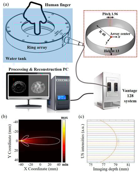 The schematic of the ring-array-based transmission and reflection USCT experimental setup is shown in Figure 4a. The setup mainly includes a custom-made ring array ultrasound transducer, a multi-channel ultrasound data transceiver platform (Vantage128, Verasonics, Kirkland, WA, USA), and the GPU-based signal processing and image reconstruction personal computer (PC). As shown in the inset, the ring array transducer has 128 elements, 40 mm radius, 13 mm height, and 1.96 mm pitch. Here the element spacing is 0.1 mm, which can maximize the reception angle of the ring array element. Each element has a central frequency of 7.5 MHz with 90% bandwidth. The US signal was amplified at the same level by the amplifier that comes with Vantage system at the level of 30 dB, 31.25 MHz sampling rate, and 14 bits resolution. A steel bar and human finger were inserted in the coupling water as the imaging targets. Each transducer element was excited with a 20 Vpp positive pulse. The imaging sequence is the same with the simulation setting, where the first transmitting pulse was fired and then all the channels (including the transmitting channel) received the response after a certain propagation time. Here, 128 transmitting and receiving events took place to acquire the full-view US data, and the entire data acquisition time was 25.6 ms.