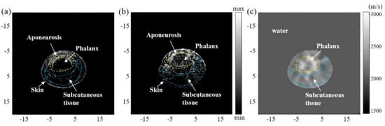 Preliminary research was further carried out on a human finger, which is in compliance with the research committee of Shenzhen University. The index finger of the volunteer was immersed in the water, and the imaging plane laid in between the proximal interphalangeal and the distal interphalangeal. The constant speed (1495 m/s) reconstructed reflection image is shown in Figure 6a, and this speed was calibrated with the iteration method (from 1450 to 1600 m/s with the step size of 5 m/s) to guarantee the real finger size. Figure 6c shows the reconstructed SoS map from the SART method using Formula (1), and we can see the phalanx area clearly. It should be noted that the image contrast is relatively low due to the fact that the acoustic speed difference in tissue is relatively small. Figure 6b shows the SoS-corrected reflection image. Compared with Figure 6a, the tissue structure, especially the phalanges and subcutaneous tissue (labelled by the yellow and blue dashed line), can be observed in both Figure 6b,c with two different acoustic properties. The measured CNRs for Figure 6a,b are 20.58 and 23.01 dB, separately. The target region was selected in the boundary of the phalanx. Note that one mask selecting the FOVs was created and blurred with a three-pixel standard deviation Gaussian filter. The blurred mask images were then multiplied with the three reconstructed images to produce the final restored image.