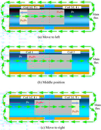 After the inductive core moves to the left, the voltage variation ∆Uleft_1 of coil 1 and the voltage variation ∆Uleft_2 of coil 2 [19,20] are
