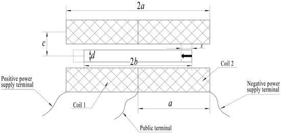 The inductive core of the displacement transducer is rigidly connected to the object to be measured, with the inductive core moving to the left as an example, as shown in Figure 3 [10]. The position of the object to be measured is obtained by measuring the position of the inductive core. After the coil has applied excitation, assume that the inductive core moves x to the left [11]. The two coils are equal in axial length and have a radius of c. The inductive core is located in the middle of the two coils, and the length and diameter of the inductive core are 2b and d, respectively.