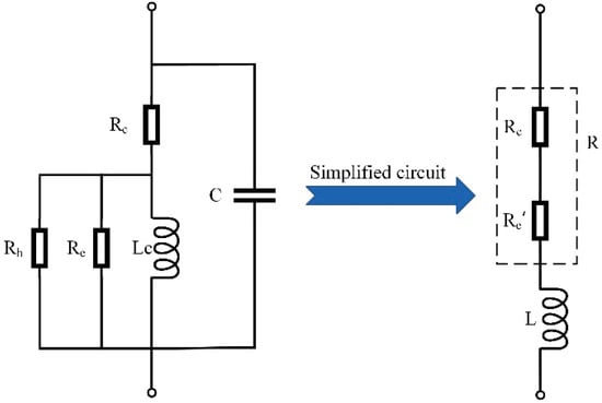 The coil of a dual-coil inductive displacement transducer is not an ideal purely inductive coil. In addition to inductance Lc, it includes copper loss resistance Rc, core eddy current loss resistance Re, hysteresis loss resistance Rh, and parallel parasitic capacitance C [15]. For analysis convenience, ignoring the parallel parasitic capacitance C, the inductive coil and its parallel resistance are equivalent to the iron-loss resistance Re’ and inductance L; the copper-loss resistance and iron-loss resistance are regarded as the resistance R of the inductive coil. The actual and simplified equivalent circuits are shown in Figure 4.